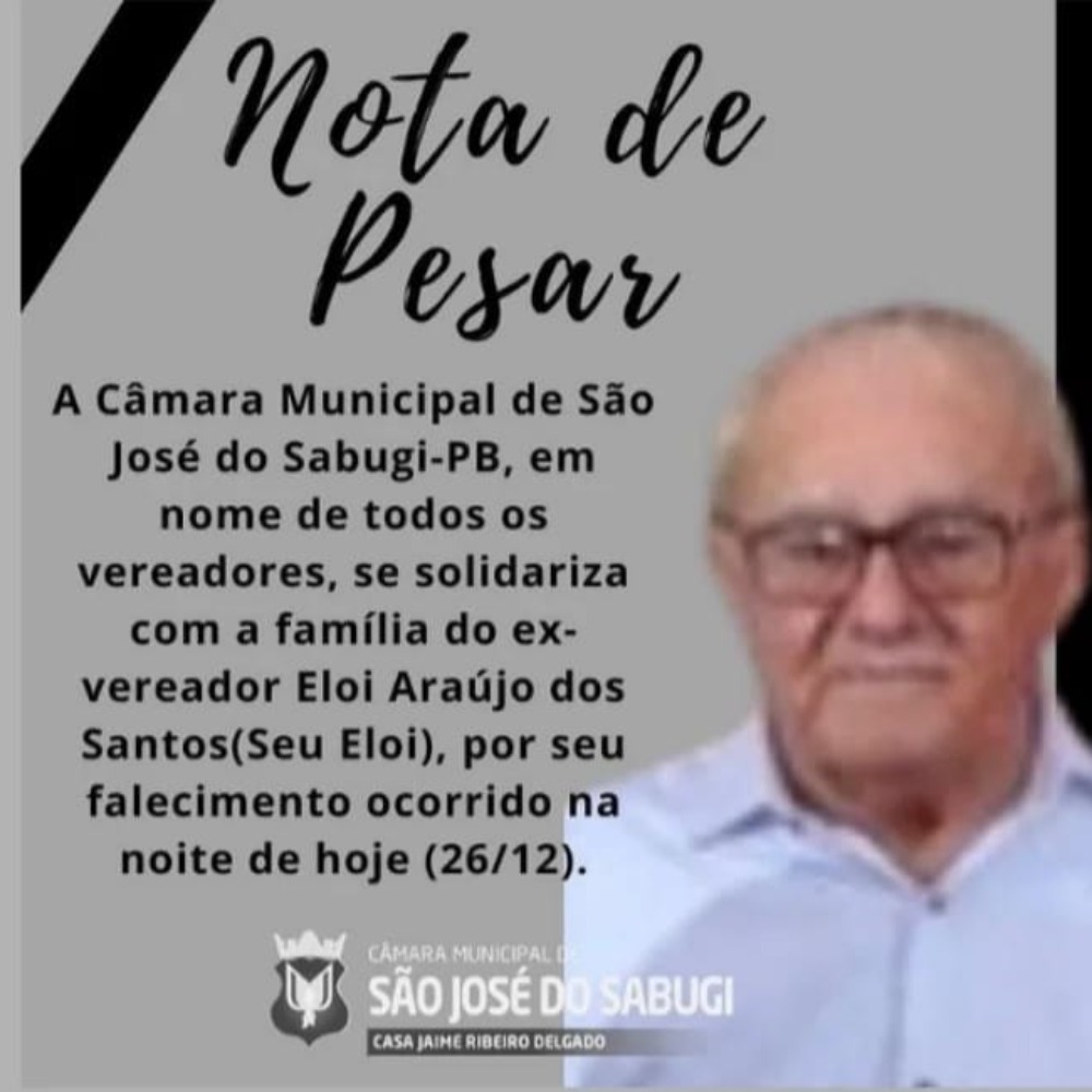 Seu Eloi foi vereador de São José do Sabugi no período de 1973 a 1976. Nesse momento de dor, nós da Câmara Municipal de São José do Sabugi nos solidarizamos com os seus familiares e amigos, elevando nossos votos de pesar pela grande perda.