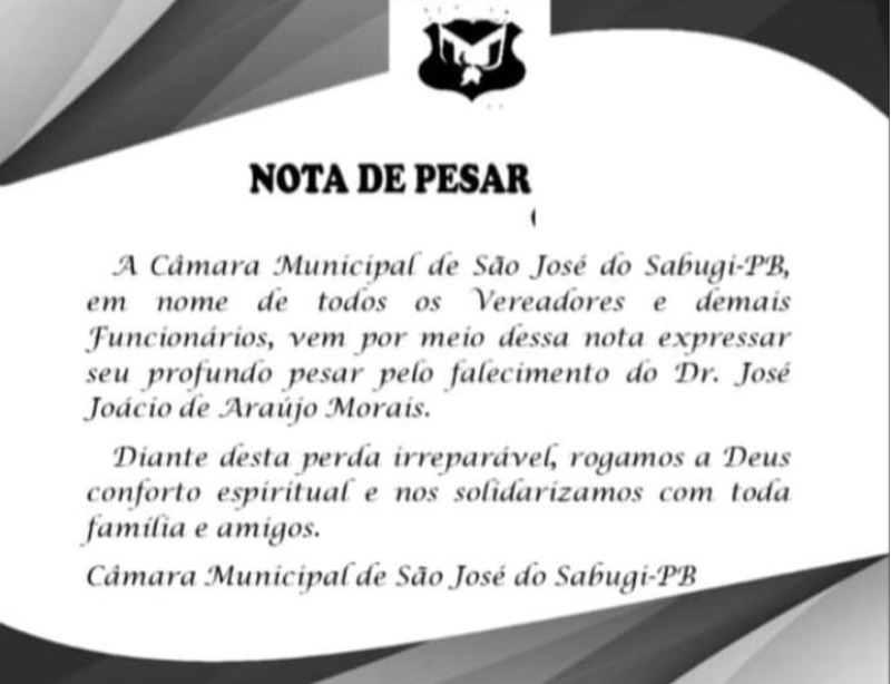 A Câmara Municipal de São José do Sabugi em nome de todos os vereadores e demais funcionários, emitiu uma nota de pesar expressando profundo pesar pelo falecimento do Drº José Joacio de Araújo Morais, ocorrido nesta quarta-feira, dia 14 de abril.